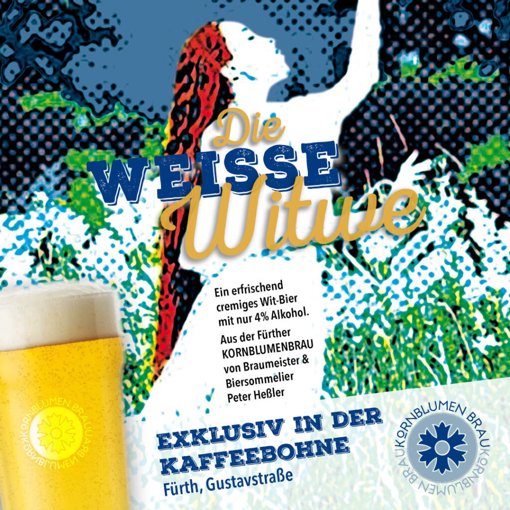 Seit Anfang Juni ist die Weiße Witwe aus der Kornblumenbrau Stammgast in der Fürther Kaffeebohne. Die lässige Kneipe mit Kultstatus in der Fürther Gustavstraße hat aktuell unser Witbier am Hahn und empfängt an sieben Tagen die Woche von 8.30 bis 1 Uhr die geneigte Biertrinkerschaft.